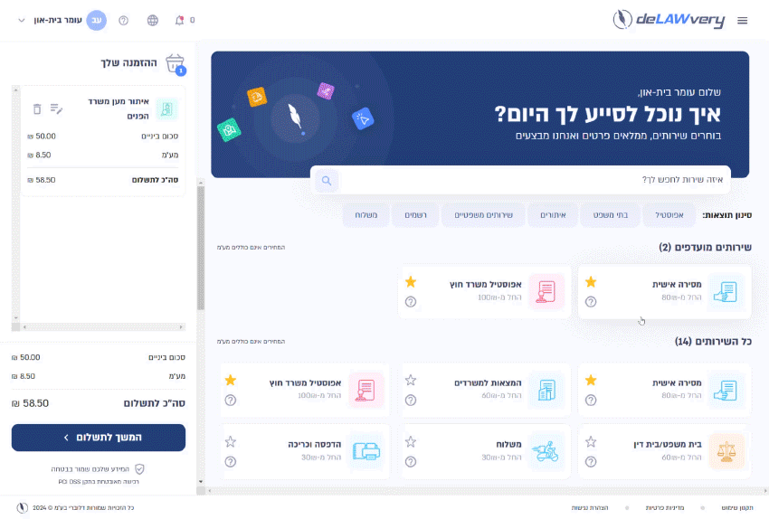 דלוברי מספקת למשרדנו פלטפורמה קלה לשימוש, דרכה ניתן לעקוב אחר שליחויות והגשות משפטיות עם שקיפות של מחירן, יכולת נוחה וקלה לנהל הגדרות והרשאות ארגון עם משתמשים רבים. דלוברי חוסכים זמן ומונעים טעויות.